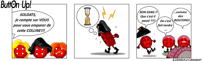 1814- Napoléon Buttonaparte et le Général Ludwig York Von Buttonburg se livrent une guerre sans merci. Une nouvelle bataille est sur le point de commencer. Les armées sont déployées, n’attendant que les ordres pour faire mouvement. Dans les deux états-majors, un même discours: « Pour vous, Boutons, l’objectif est clair: Etre en première ligne ! »