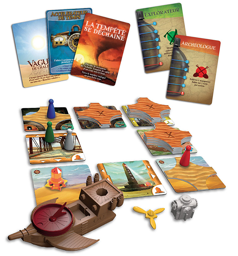 Matériel : 49 cartes, 48 marqueurs Sable, 24 tuiles, 6 marqueurs en plastique, 6 pions, 4pièces Machine volante, 1 échelle Tempête de sable, 1 socle, 1 maquette Machine volante, 1 règle du jeu.