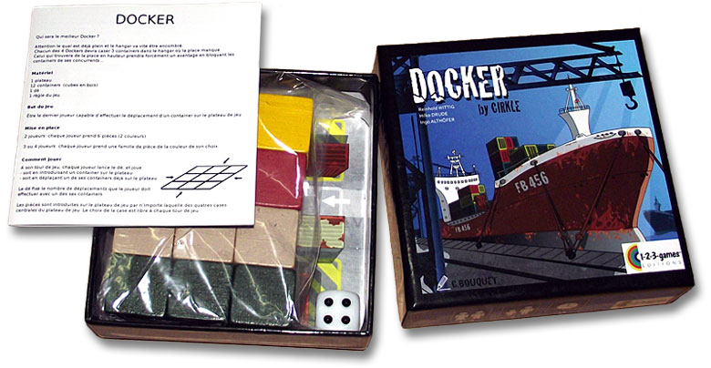 Docker est une réédition française du jeu allemand Omba (Reinhold Wittig, Hilko Drude, Ingo Althöfer), qui se voit, pour l'occasion, rethématisé et relooké.