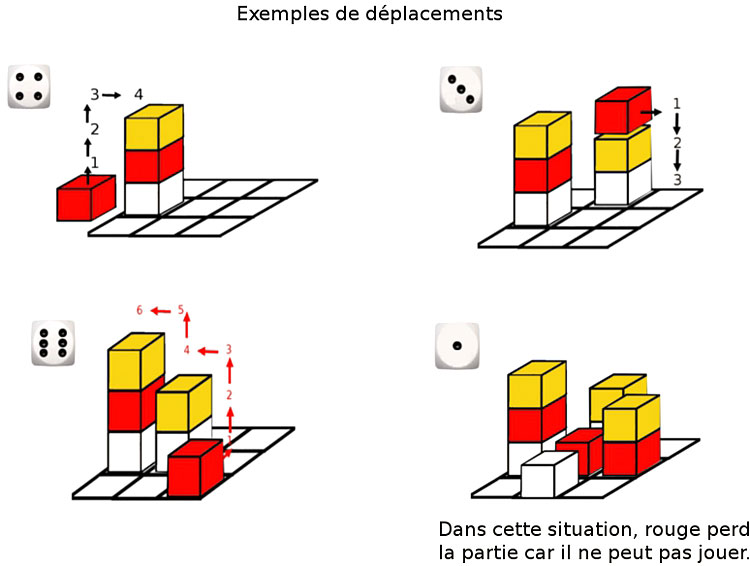 Les pièces se déplacent dans 5 directions (avant, arrière, à droite, à gauche et en hauteur). Il ert interdit de reculer durant un déplacement.