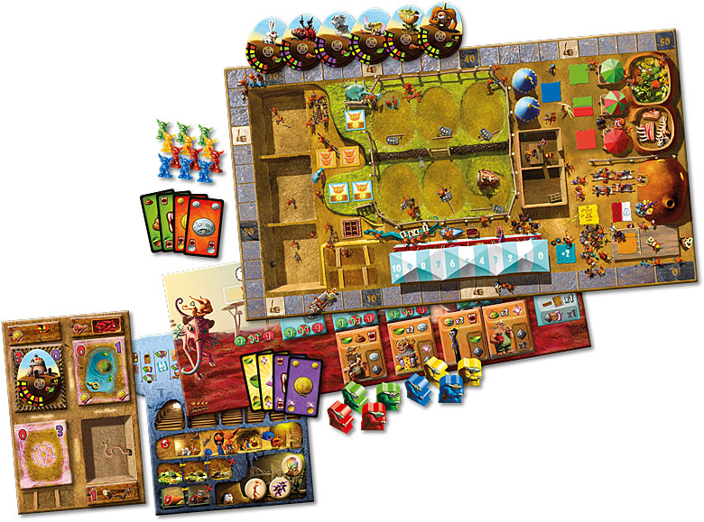 Matériel : 1 plateau central réversible, 1 plateau progression réversible, 4 plateaux terrier (4 couleurs), 4 plateaux monstrerie, 18 monstres avec une roue pivotante, 20 attaches pour assembler les monstres, 11 tuiles cage, 6 tuiles amélioration, 10 tuiles artefact, 8 tuiles concours, 8 tuiles client, 104 cartes besoin (4 types), 5 cartes potion, 8 pions larbin (4 couleurs), 40 figurines diablotin (4 couleurs), 4 tuiles succès (4 couleurs), 40 jetons or, 14 jetons légume, 11 jetons viande, 30 jetons bouse, 20 jetons souffrance, 8 jetons mutation, 1 marqueur progression, 1 jeton premier joueur et 1 livret de règles.