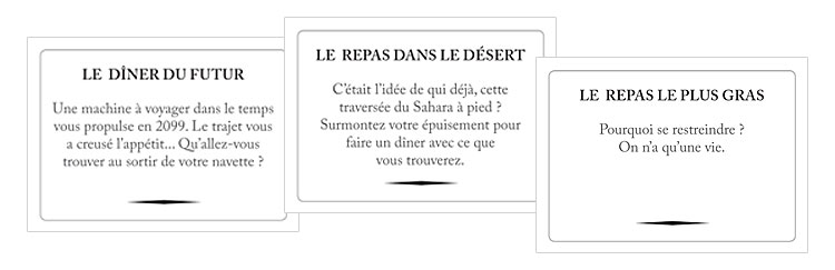 Chaque joueur reçoit une carte Thème parmi les 100 différentes disponibles. La carte Thème indique un menu bien particulier qu’il va falloir composer : le repas sur la banquise, la cantine, le congrès des sorcières, le déjeuner sur l’herbe, etc.