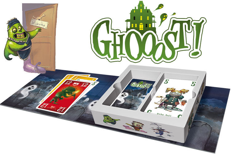 Ghooost! est un jeu de cartes rapide et malin dans lequel les joueurs vont tenter de se débarrasser au plus vite de toutes leurs cartes : celles de leur main, bien entendu, mais surtout celle de leur pioche personnelle, ou “manoir”. Mais pas question d'y toucher avant que la pioche commune soit épuisée, ni tant qu'ils ont encore des cartes en main !