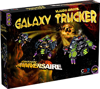 Galaxy Trucker, Édition Anniversaire contient tout ce dont un vrai camionneur de l’espace a besoin (et peut-être même un peu plus) dans une seule grosse boîte : Tout le matériel du jeu de base Galaxy Trucker et de ses 2 Grosses Extensions est présent, le tout agrémenté d'un thermoformage en plastique bien pratique pour que tout soit rangé bien comme il faut...