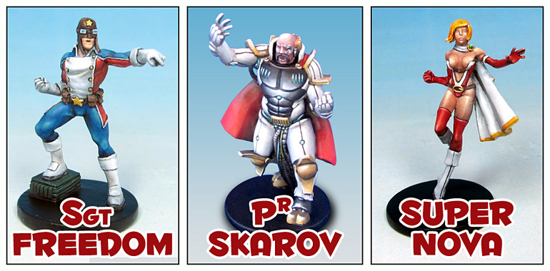 Matériel : 4 Héros (avec chacun : 1 figurine, 3 fiches de personnage - 1 normale, 1 version Rookie, 1 version Vétéran) et 1 set unique de cartes Pouvoirs), 5 super-méchants (Pr. Skarov, les 3 sœurs Kinoichi et 1 ennemi mystère, avec chacun 1 figurine et 1 fiche de personnage), 30 figurines de sbires (10 Androïdes spécialisés dans le corps-à-corps, 10 Gynoïdes expertes du combat à distance, 10 Arachnoïdes aux effets de zone dévastateurs), 20 cartes Événements, 9 plateau Base recto-verso (5 pièges, 3 objectifs et 1 accès), 4 dés Héro, 4 dés Méchant, 5 dés Neutre, 5 Dés Mental, 1 livret de règles et 1 livret de scénarios.