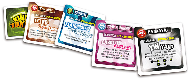 Ces cartes sont mélangés, face cachée, en début de partie. À chaque fois qu’un Monstre fait 3 Cœurs, il pioche une Évolution en plus des effets normaux, même sur Tokyo.
