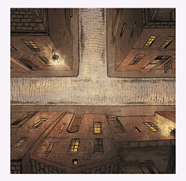 En premier lieu on va construire le plateau avec neuf tuiles sur lesquelles sont représentés, sur le recto, les rues de la ville ainsi qu'un des personnages et sur le verso le même dessin sans le personnage (lorsqu'un personnage est innocenté, on retourne simplement la tuile !). Chaque personnage dispose d'une carte Alibi, mais ici les cartes servent juste à faire avancer l'enquête et à déterminer qui est Mr Jack pour la partie.