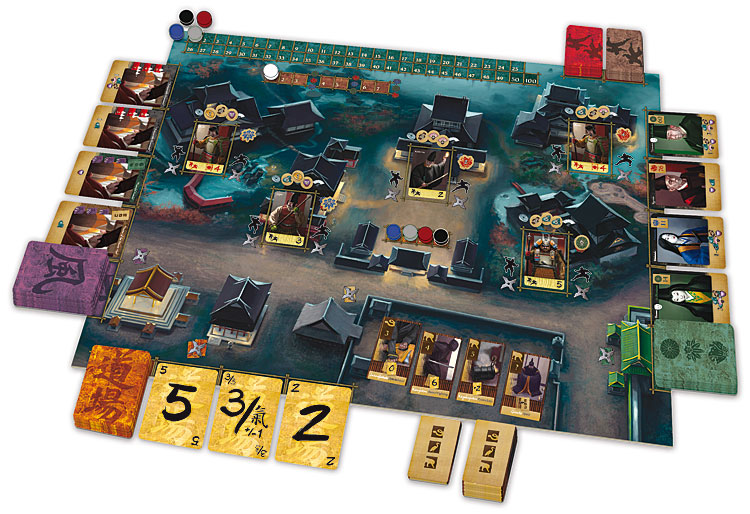 Matériel : 1 Plateau de jeu, 15 Jetons de Clan, 19 Tuiles Pouvoirs de Ninja, 90 Jetons Trésor, 30 Cartes Rumeur, 52 Cartes Dojo, 21 Cartes Émissaires, 40 Cartes Gardes, 20 Cartes Gardes d'Élite, 12 Shurikens en bois, 12 Marqueurs d'Honneur en bois, 1 Marqueur de Tours, 1 Sac à Trésor et 1 Livret de Règles.