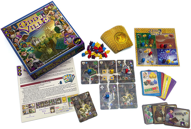 Matériel : 64 cartes Bâtiment/Pièce, 1 carte Quartier Central, 16 cartes Ouvrier, 36 pions Ouvrier, 1 plateau Ressource, 12 cartes Personnage & 1 Livret de Règles.