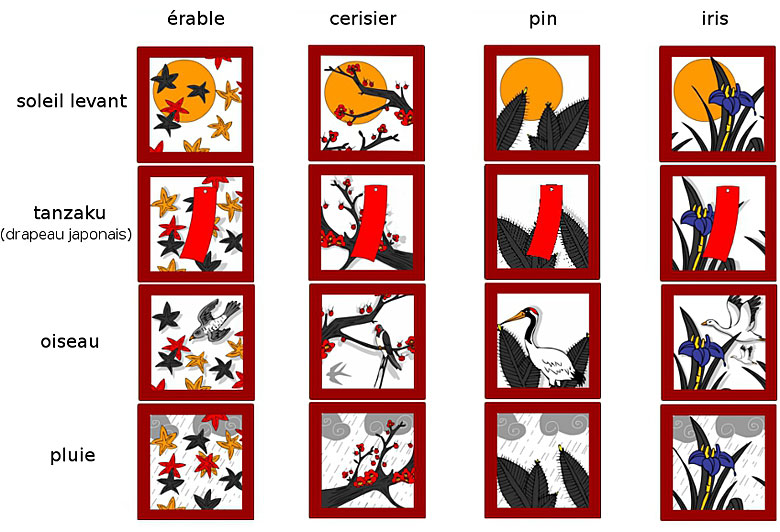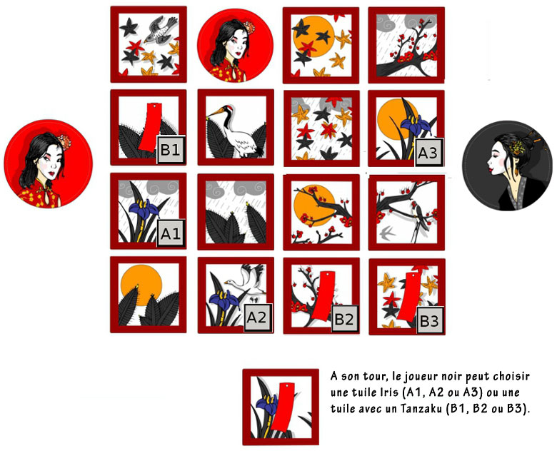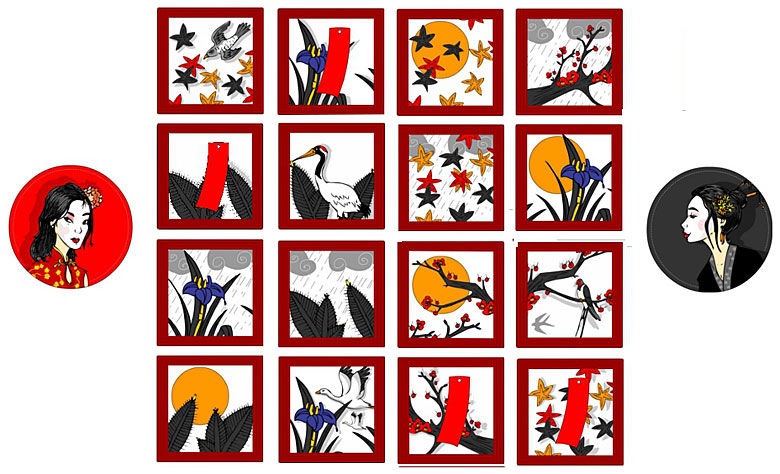 Matériel : 8 cartes Geisha pour le joueur rouge, 8 cartes Geisha pour le joueur noir, 16 tuiles Jardin Impérial.