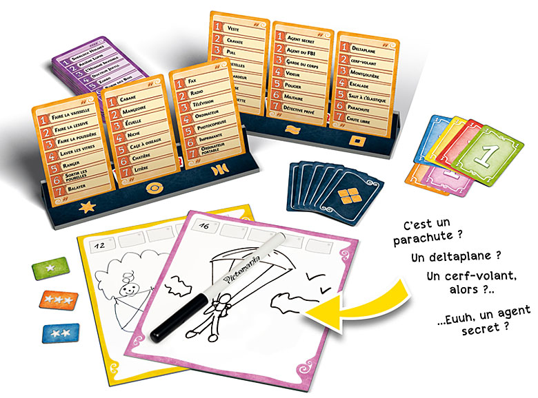 Matériel : 6 ardoises pour dessiner, 6 marqueurs effaçables, 6 chiffons pour effacer, 6 lots de 5 jetons Score, 6 lots de 7 cartes Pari, 13 cartes Noires, 5 jetons Bonus, 99 cartes Mots recto-verso avec 4 niveaux de difficulté, 2 présentoirs de cartes et 1 livret de règles.