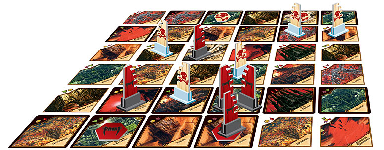 Chaque joueur dispose de 2 capitales et 5 Armées. Ce sont ses 10 cartes de développement qui donnent une identité à sa faction et lui permettent de mettre en place sa stratégie. Le plateau est composé de cartes terrain placées de façon aléatoire.