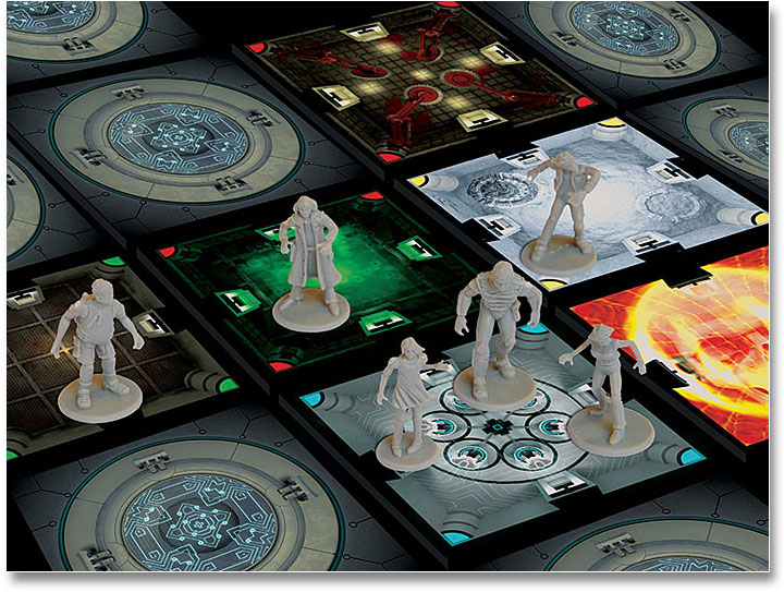 Matériel : 32 tuiles de salles, 1 compteur réversible, 6 tuiles Rôle, 6 jetons Contrôle, 6 figurines, 24 jetons Action, 6 balises mémorielles, 6 marqueurs de tour, 6 fiches Personnage.