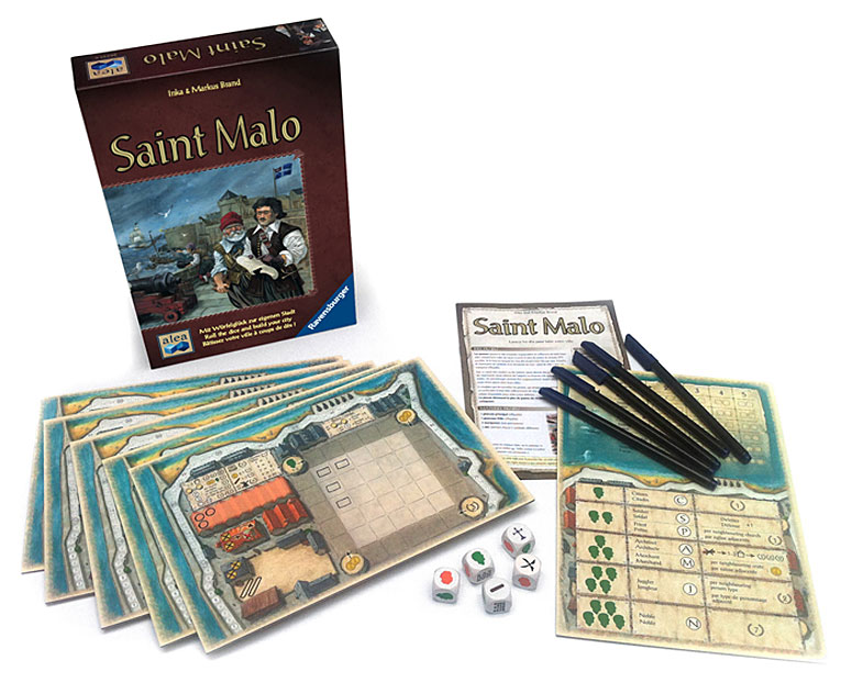 Alea c'est la branche Gamers de Ravensburger, une branche crée pour se démarquer de produit habituels du géant germanique, en proposant des jeux de pousseurs de cube sélectionnés sur le haut du panier (comme Chinatown, Louis XIV ou l'année du Dragon). Saint Malo joue la carte de la surprise, car si l'habillage est très allemand : austère, peu attrayant et laissant à penser qu'il s'agit d'un énième jeu de gestion, pour autant le jeu s'inspire du Yam et se joue donc avec des dés...mais est ce un jeu familial pour autant ?