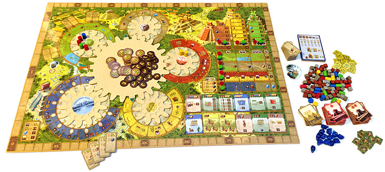 Matériel : 1 plateau de jeu à assembler, 6 rouages de tailles diverses, 6 attaches, 1 planche d’autocollants, 24 ouvriers, 28 marqueurs de tour, 4 marqueurs de score, 65 cubes en bois (bois, pierre et or), 13 crânes de cristal, 65 jetons Maïs, 28 tuiles Récolte (16 maïs et 12 bois), 21 tuiles Richesse de départ, 13 monuments, 32 bâtiments repartis en 2 périodes, 4 plateaux de jeu individuels réversibles, 1 jeton Premier joueur & 1 Livret de Règles.