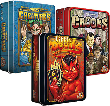 White Goblin Games nous propose en fait trois petits jeux de cartes dans sa gamme "boites en fer" : Dans Crazy Creatures nous allons aider le Dr Doom à créer des créatures farfelues, tandis que Crook nous fera endosser le costume d'un escroc en quête d'argent facile. Enfin, Little Devil est un jeu dans lequel il faut éviter de ramasser les diablotins synonymes de points de pénalité...