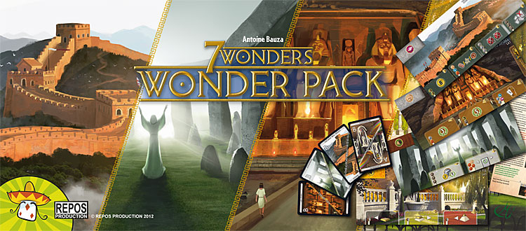 7 Wonders, le jeu de civilisation light, multi-primé partout dans le monde, voit sa famille s'agrandir d'une extension nommée Wonder Pack n°1 (ce qui laisse sous-entendre qu'il y en aura d'autres...) qui contient quatre nouvelles merveilles à ajouter à notre boite de jeu...