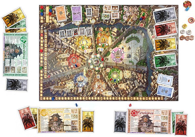 Matériel : 1 plateau de jeu, 5 plateaux de Clan, 59 grandes cartes Mission, 109 cartes, 20 pions en bois, 16 marqueurs en bois, 40 tuiles Arme, 16 tuiles Annexe, 84 pièces Mon, 10 jetons Emplacement Bloqué, 7 jetons Geisha, 5 jetons Bénédiction, 1 jeton Quartier Fermé, 1 jeton Patrouille Impériale, 2 pions Patrouille Impériale en bois, 1 livret de règles.