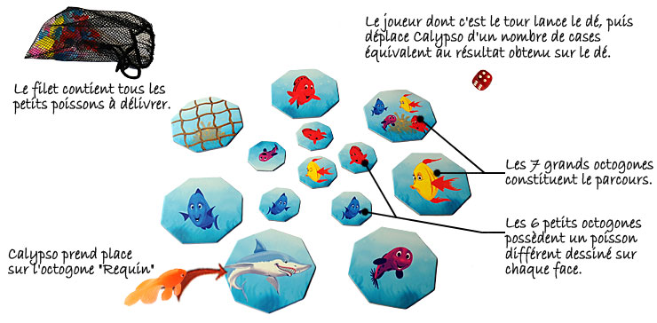 Le jeu est composé de 7 grands octogones que l'on place en cercle au centre de la table : ils constituent le parcours. Au centre du cercle on positionne 6 petits octogones comportant un poisson (différent) déssiné sur chaque face. Calypso prend place sur la case "requin" et les 30 petits poissons colorés débutent la partie dans le filet qui est posé à côté du parcours.