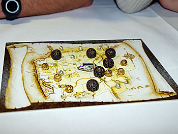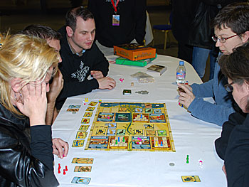 Les Offs, ici nous testons Machu Pichu de Bruno Cathala et Antoine Bauza en compagnie de Vincent Everaert, le jeu est du genre tactile et il faudra procéder avec doigté . On voit aussi le mystérieux tee-shirt de Bruno (Soleil Levant ?).