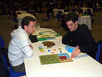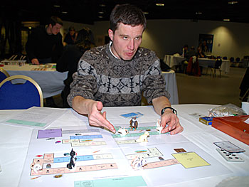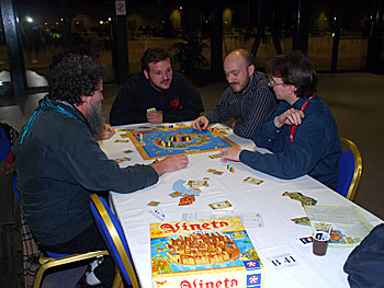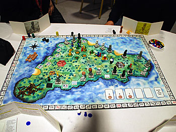 Autour du plateau des Géants de l'île de Pâques, on trouve l'auteur Fabrice Besson (en haut à droite), Cedric l'auteur d'Olympys (en bas à droite) un proto qui semble bien abouti et dont on entendra surement parler et Anne-Cécile sa douce et tendre...