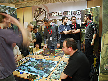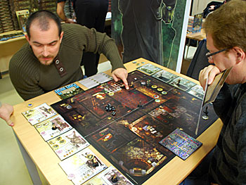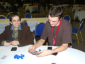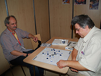 François Haffner en discussion avec Kris Burm devant un plateau de Tsaar...