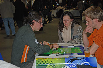 Les Offs c'est quand même, avant tout, des protos qui viennent se confronter aux joueurs. Ici Antoine Bauza et Cédric Caumont présentent 7 Wonders, une des prochaines sorties de Repos Prod. Un jeu de cartes malin dans lequel on interagit avec ses voisins immédiats...