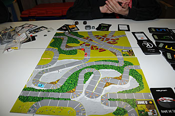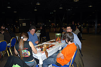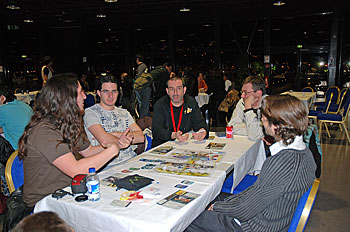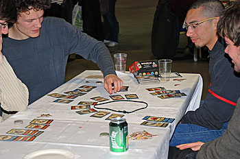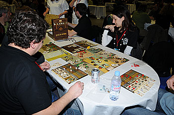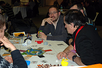 Retour sur Yggdrasil, qui aura pas mal tourné sur ces Offs, à, Gauche en compagnie d'une équipe affûtée de Montpellierains super sympas et rompus à l'art du jeu coopératif, à droite Cédric suit une partie dont l'équipe comprend Antoine Bauza, Ts Leodagan, Mr Ludocortex, un animateur de chez Upperdeck, ainsi que sa gente dame...
