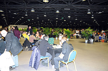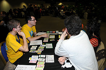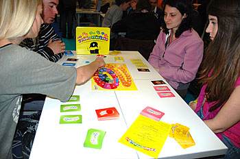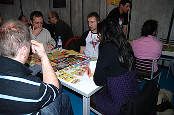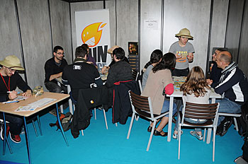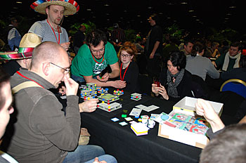 Bon alors à Cannes il y a le Festival dans la journée, mais aussi les Offs qui se déroulent la nuit et dont le succès, qui ne se dément pas, en a fait évoluer (involontairement) un peu le concept. Il y a tellement de monde maintenant lors de ces soirées qu'on a du mal à trouver à s'assoir si on débarque après 22h ! Et si les protos et les auteurs sont toujours là (comme sur la photo de droite par exemple sur la quelle on voit l'équipe de Libellud autour d'un proto), ils commencent à être un peu dilués dans la masse de tables et de jeux...