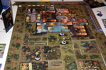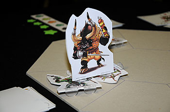 En compagnie de Guillaume Blossier, nous avons testé le premier jeu à venir chez Pulsar Games, la jeune société d'édition qu'il a co-crée avec Fred Henry. Ultimate Warriorz prend sa source sur les fondations d'un Mad Arena entièrement remanié. Ce jeu d'affrontement léger et rapide à jouer est très bien vu : on se poutre joyeusement la gueule, par personnages interposés, dans un combat nerveux et sans pitié. On voit le résultat final de notre partie sur la photo de droite où mon pauvre Gobelin (le bien nommé Cactus !) vient de perdre le combat final...