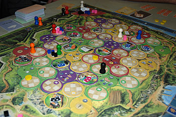Partie en préparation de Rampage de Ludovic Maublanc et Antoine Bauza, un jeu déjanté où des monstres sanguinaires détruisent tout et dévorent les pauvres meeples sans défense. A sortir chez Repos Prod (forcément ).