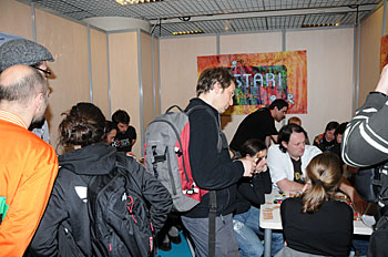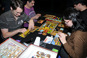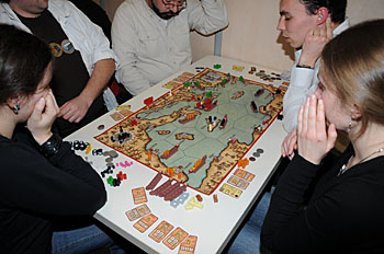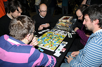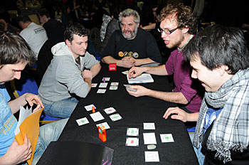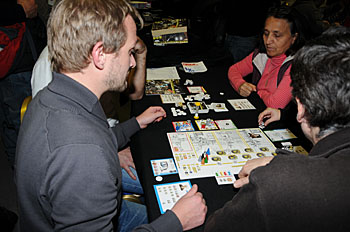 Bruno Faidutti faisait tourner sa dernière création. Mascarade (nom sans doute provisoire) est un jeu de bluff qui fonctionne bien et nous a bien fait rigoler. A sortir prochainement, le jeu étant déjà signé...