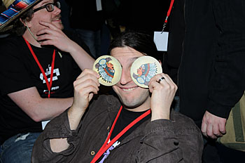 Tschak! est un jeu léger de donjon très accessible que nous avions testé à Essen l'an dernier. Tiens, devinez ce qui est représenté sur le tee-shirt de Malcolm (ce n'est pas bien difficile pour ceux qui connaissent le bougre ).