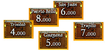 6 des 16 tuiles coffres aux trésors, que l'on a préalablement mélangées face cachée, sont placées sur les villes qui leur correspondent. Les autres sont posées sur le plateau, face cachée, en 5 piles de 2 et constituent la réserve de coffres. Les valeurs des trésors s'échelonnent de 4000 à 8000 doublons.
