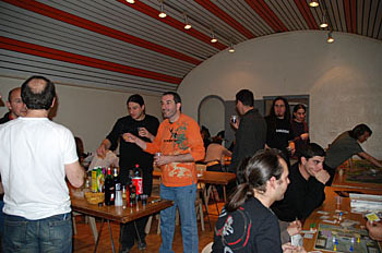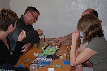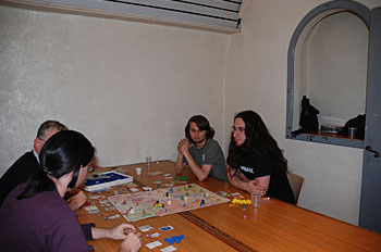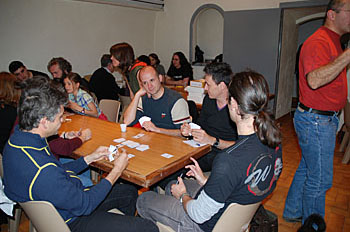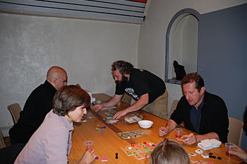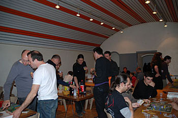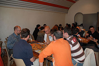 ...des tables où l'on joue (ici en haut : Mathieu et Cédric qui s'affrontent sur Gosu, en bas : Serge Cécile, Bruno et Maëva qui jouent à In Nomine Domino de Bruno Faidutti et Dr Mops)...