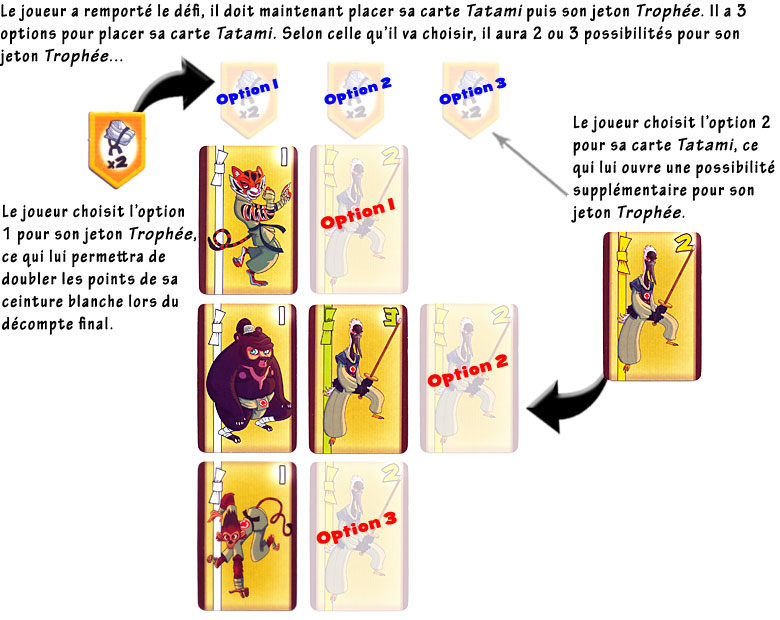 Si un joueur a remporté un défi lors de ce tour, il doit, après avoir positionné sa carte Tatami, placer son jeton Trophée.