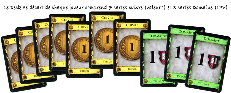 Chaque joueur reçoit 3 cartes Domaine et 7 cartes Cuivre qui constituent leur deck de départ. On place ensuite les cartes Trésor (cuivre, argent et or), les cartes Victoire (12 domaines, 12 duchés et 12 provinces à 3 ou 4 joueurs), ainsi que les cartes Malédiction, en piles, face visible.