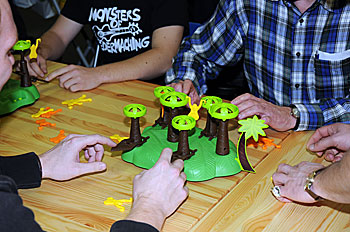 Alors celui là je n'ai plus souvenir de son nom, mais par le jeu de ces "arbres supports" rotatifs, les 2 joueurs doivent amener leurs singes de l'autre côté tout en empêchant l'adversaire de faire de même, en poussant les trappes pour faire "sauter" le singe de l'arbre. Marrant !