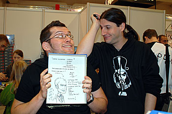 Mathieu supervise, d'un oeil bienveillant, les explications d'Hicham sur les géants (en gros il fait semblant de comprendre l'anglais, arf ! )