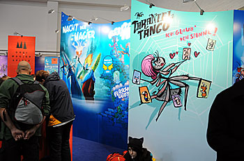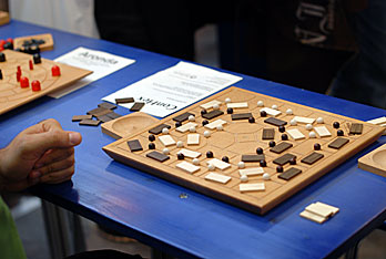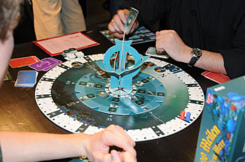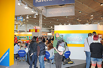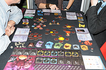 Chez Days of Wonder, c'est Smallworld qui est à l'honneur, un grand nombre de tables étaient mises à disposition pour tester cet excellent jeu et l'on pouvait acheter les 2 petites extensions sorties pour l'occasion. Bien sur on pouvait s'essayer aussi à d'autres jeux de l'éditeur, comme l'incontournable Aventuriers du Rail, (Zug um Zug dans la langue locale ) avec l'extension 1912.