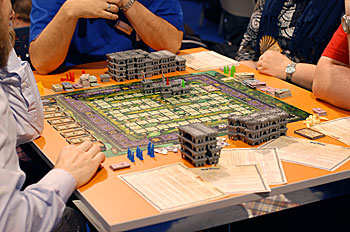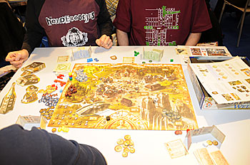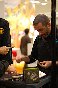 Mathieu, Gaby et moi, pris par la patrouille, en train de jouer à Wazabi sur le stand de Gigamic. Victoire de Gaby...