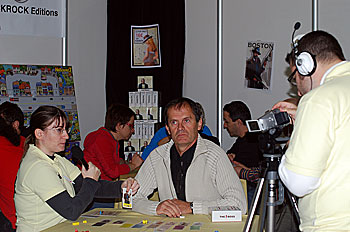 Aaaah Rallyman, un jeu génial et un auteur génial ! JCB c'est une pile électrique qui explique inlassablement et avec entrain le principe de son jeu...Et en plus il a un beau tee-shirt Rallyman ! (mais il ferme les yeux quand on le prend en photo, va falloir rectifier ça JC ! )