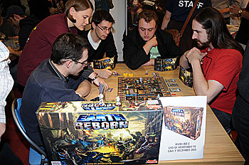 Comme l'an dernier Hazgaard et Ludically se côtoyaient sur un même stand. Du côté de Ludically, on présentait Earth Reborn, un jeu de plateau avec figurines de Chris Boelinger. Chez Hazgaard il y avait du lourd, en plus de la gamme boite en fer (Pocket Rocket/Crazy Mix/Timeline), on trouvait également la Cité des Voleurs, ainsi que l'excellent Intrigo...largement de quoi se faire plaisir !