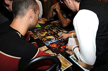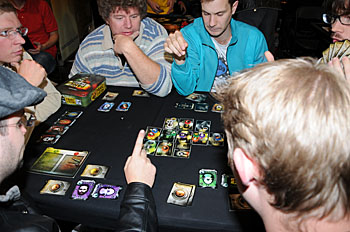 Cet espèce de plateau bizarre en forme de cible c'est le plateau de Dungeon Fighter chez Cranio Créations. Un jeu qui provoque, chez les joueurs, un comportement bizarre...
