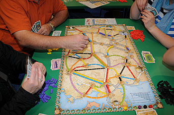 ...On trouvait évidemment du Smallworld Realms (à gauche) ou de l'Aventuriers du Rail (à droite) dans une version avec le plateau allemand de Marklin dans une boite classique.