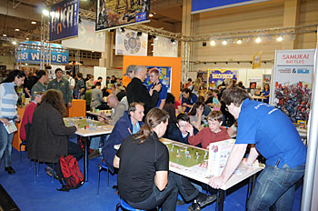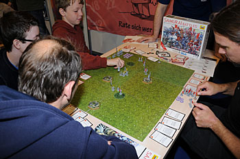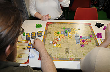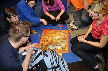 C'est traditionnel à Essen : il n'y a plus de table libre pour jouer ? asseyons nous par terre pour tester immédiatement notre achat ! Ici une partie de Waka Waka de Rüdiger Dorn...