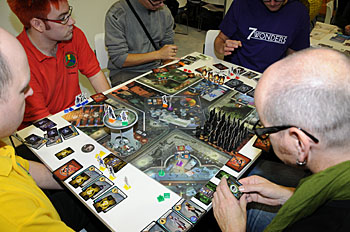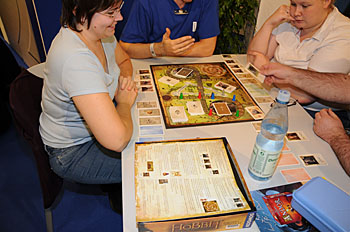 Et pour rajouter un peu de fumée devant la forêt, Essen c'est en Allemagne (je sais c'est dur comme révélation, mais il faut s'y faire ) avec toute la froideur et la rigidité que ça sous-entend : ne cherchez pas de chaleur à Essen (même si paradoxalement il y a fait très beau cette année), ce n'est pas le point fort de nos amis allemands. Pour exemple : vous êtes éditeur et vous avez prévu de faire un pot (entre francophones hein ! de toutes manières les allemands sont déjà rentrés chez eux..), vous devez prévenir l'organisation qui va vous envoyer des gorilles très aimables (du genre hommes en noir d'une mauvaise série américaine) pour encadrer le truc et vos pouvez compter sur eux pour vous faire comprendre par de tonitruants et gutturaux hurlements germaniques que c'est l'heure et qu'il faut décamper vite fait ! aimables je vous dis !...