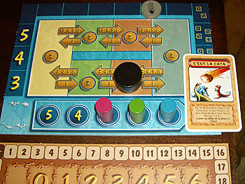 Stef choisit ce moment pour jouer sa carte "C'est la cata", du coup pas de tirage aléatoire de climat, le pion va se déplacer de 2 cases dans la même direction. Voilà qui atténue grandement l'intérêt du gène "Fourrure" que je viens d'acquérir. Le pion climat ne fera pas d'arrêt sur la zone "montagne" .
