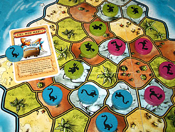 Ici une carte "Motivation" jouée par Mimi, carte qui lui permet de déplacer chacun de ses dinos présents sur le plateau. Ce qui n'est pas négligeable, puisqu'elle en à 6 et que même avec 2 gènes "Patte" ce devient compliqué de survivre pour toutes ces bestioles... d'autant qu'un 7ème va faire son apparition pendant la phase des naissances.