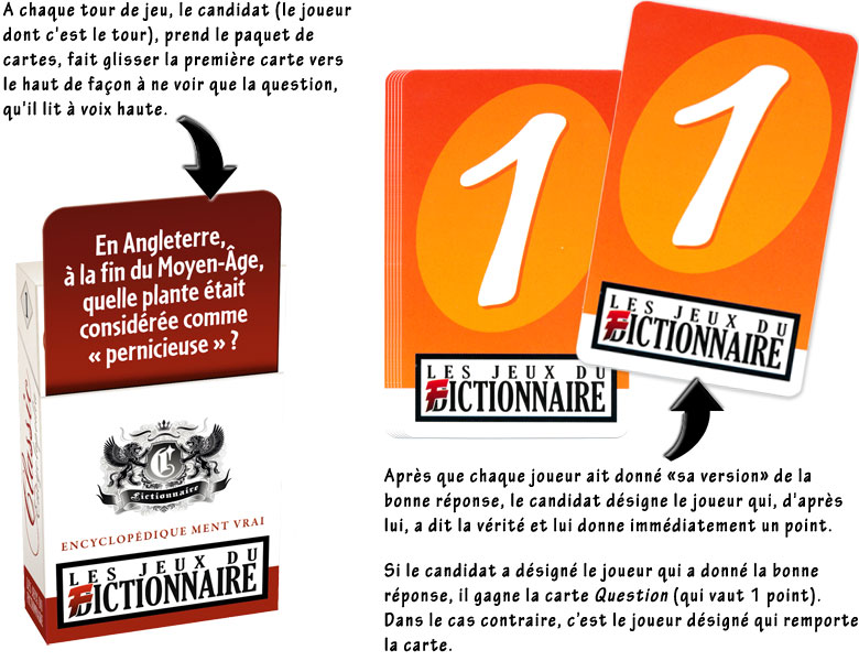 S'il s'appuie sur la base du jeu du Dictionnaire, les jeux du Fictionnaire n'en sont que des lointains cousins, parce qu'ici c'est le bluff et la tchatche qui sont au centre du jeu. Ce qui est bien c'est que le jeu laisse aussi de la place à ceux qui n'aiment pas parler trop longtemps : on peut très bien faire des réponses courtes et au pire, si on est en manque d'inspiration, il est toujours possible de passer son tour. De toutes manières après une trop longue hésitation, il sera bien difficile de convaincre que l'on donne la bonne réponse !
